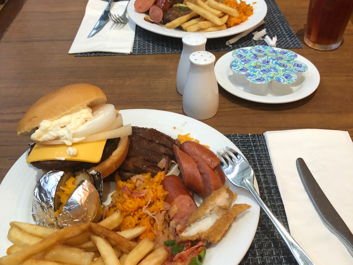 自分でハンバーガーを作れるのでトリプルバーガーを作ったり、美味しいデザートを食べたり、満足でした。野菜はグアム全体的にうまくないけど、飽きない位の種類はありました。