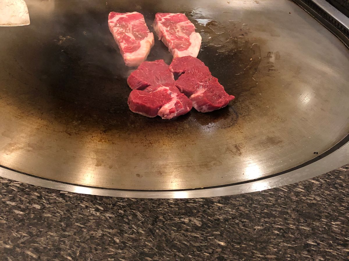 目の前の鉄板焼きで焼いてくれウチは子供がいたからか玉ねぎで煙突を作って電車に見立て華麗なパフォーマンスもしてくれました。