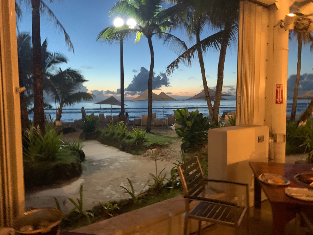 天候に恵まれサンセットを楽しみに20分前にチェックインしましたが、通された席は写真とは程遠いビーチから離れた奥の席で、アウトリガー側のフェンスは工事用シートで覆われており全くサンセットは拝めませんでした。着席時にはビーチ側に空席がたくさんありスタッフに変更を訴えましたが却下され、挙句は煙に巻かれて幼児がギブアップ。飲み放題のビールは何度も督促しないと運ばれずイライラ…1時間も経たずに退散しました。こんなことならアウトリガーにすべきだったと後悔しています。