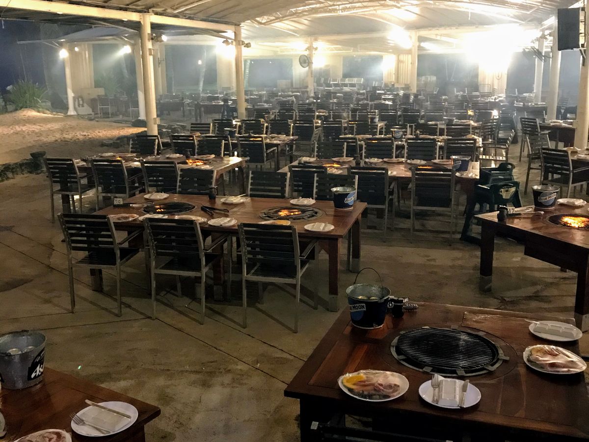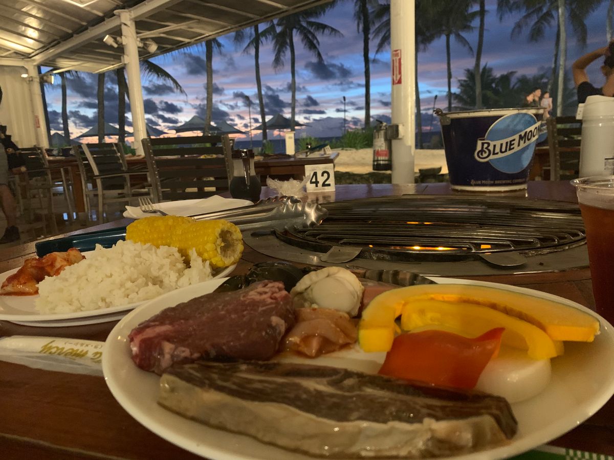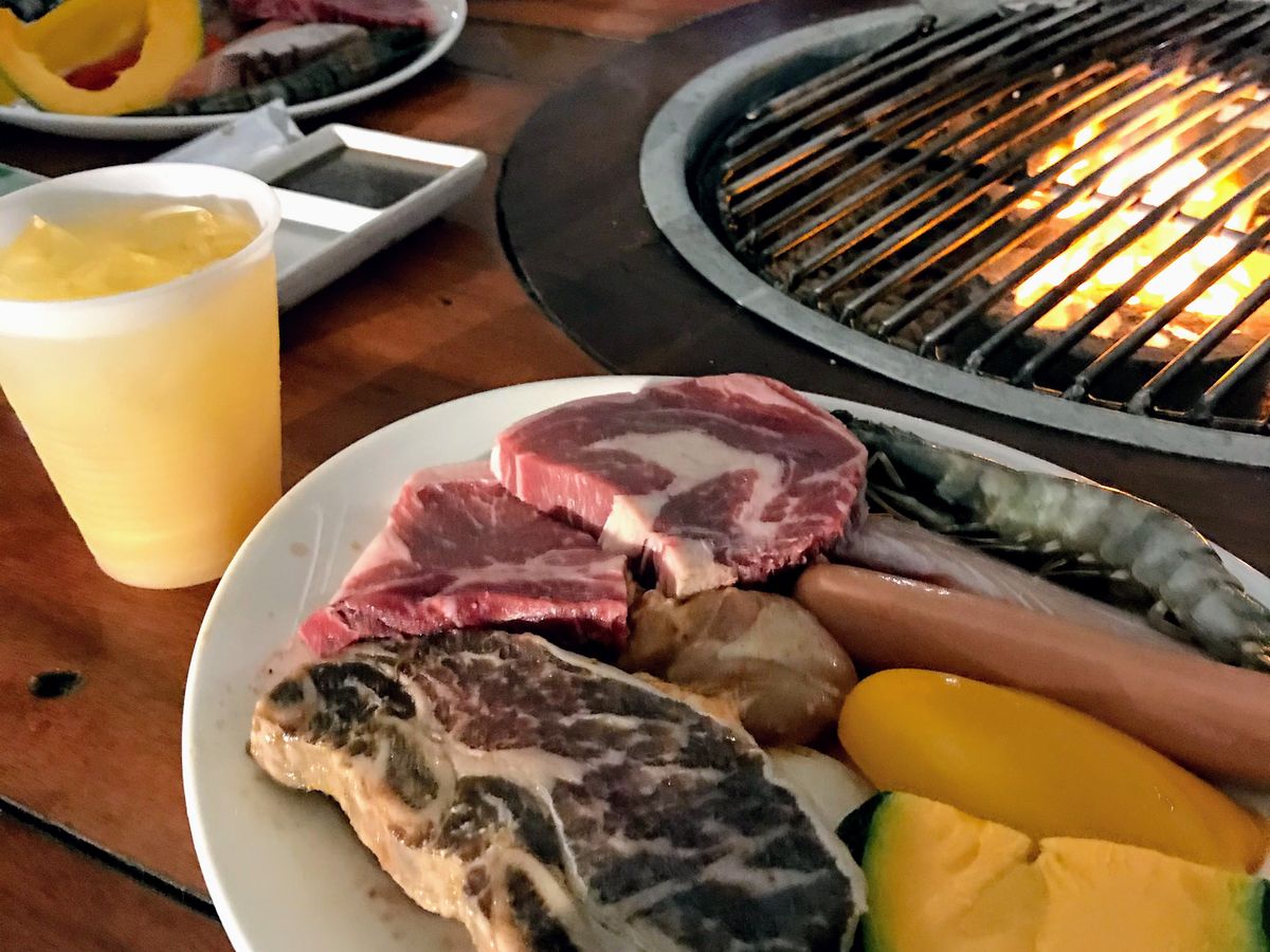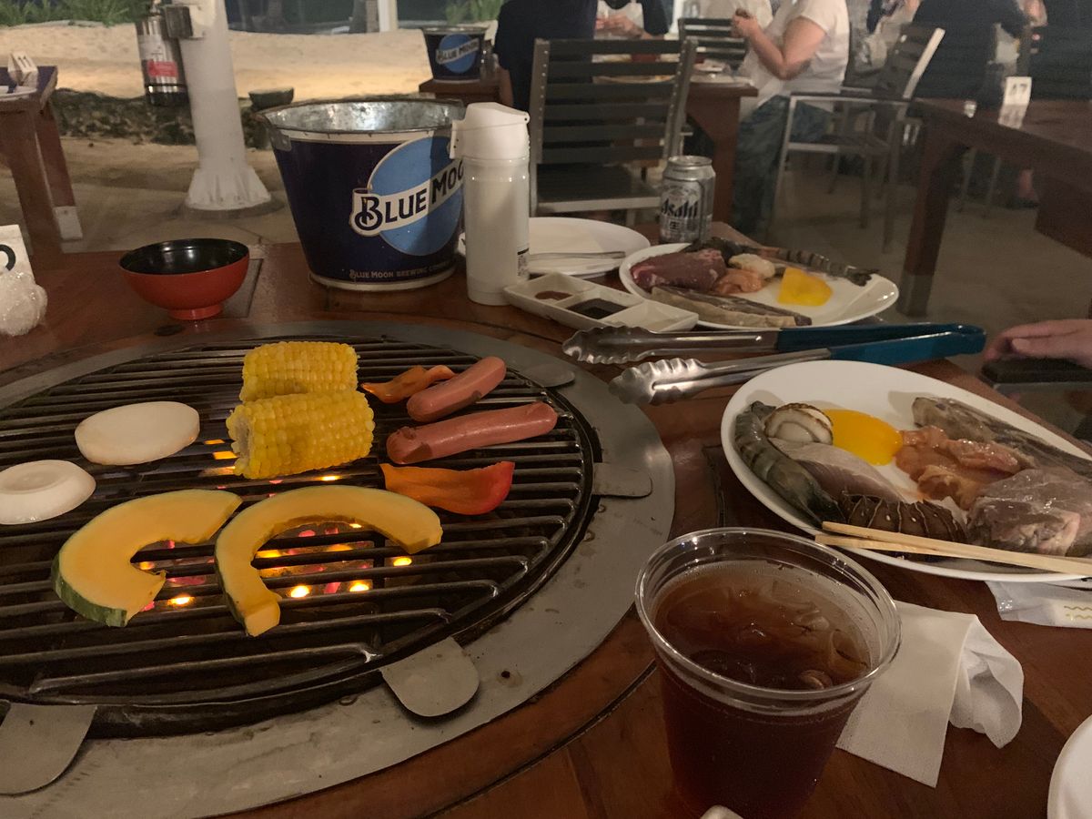 テーブルにあらかじめ肉や魚介類なのど焼く材料が置いてあり、サラダやご飯、キムチ、素麺がビュッフェスタイル。飲み物はテーブルに冷やした缶ビールが5本くらいバケツに入っていて、ソフトドリンクはバーに行って作ってもらうスタイルでした。
