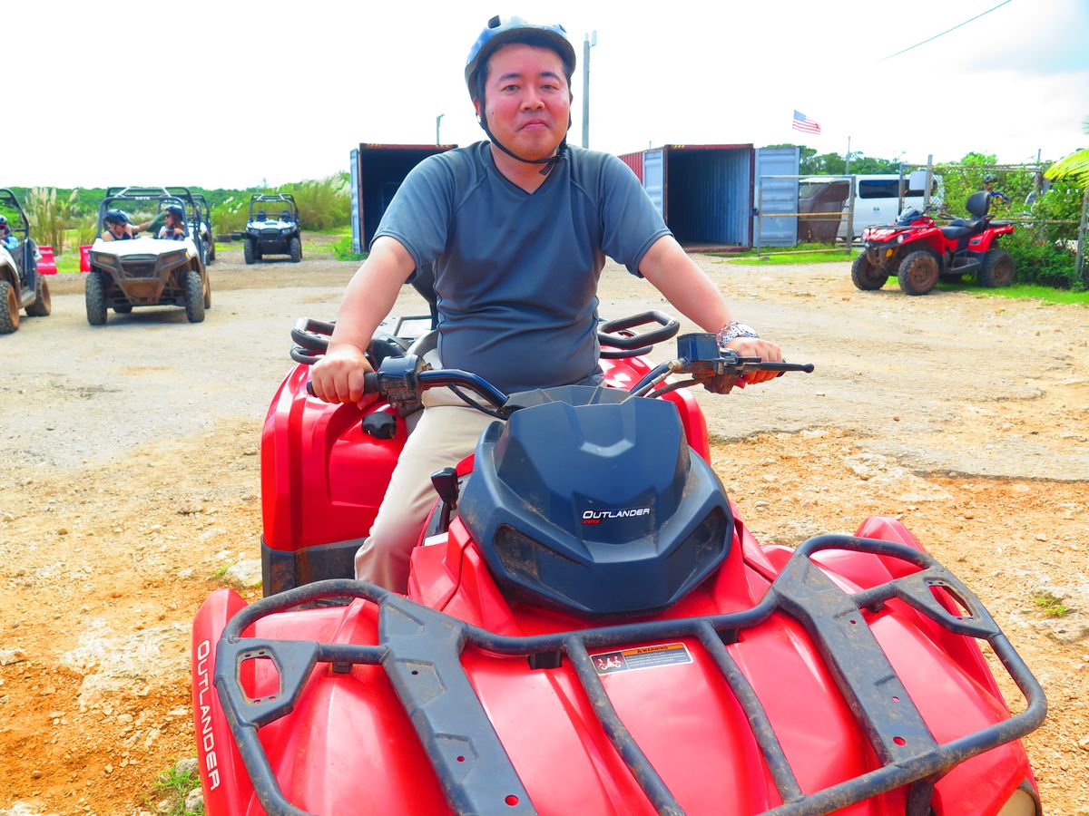 初めてATVという一人乗りバギーを体験しました。ハンドルはオートバイと同じような感じでしたが、アクセルが親指で押して操作するという珍しい乗り物でした。ブレーキはオートバイと同じレバーを握るタイプでした。