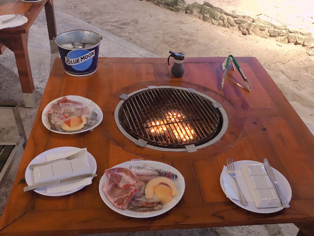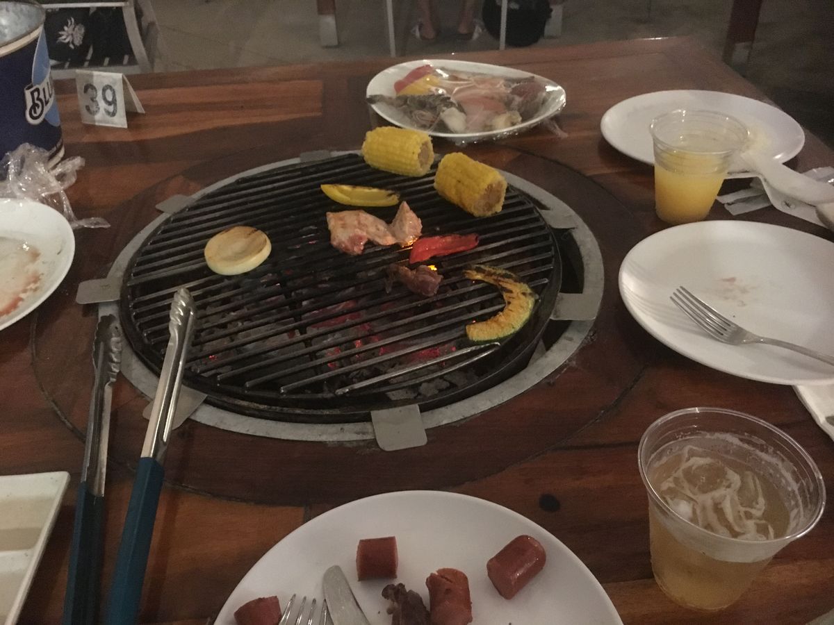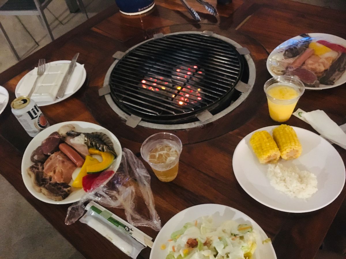 食事内容は、最初にテーブルにお肉と魚介類がセットしてあり、バケツに氷とビールが4本くらい入っています。セルフのサラダやキムチ、素麺、フルーツはビュッフェ形式です。バーカウンターで追加の飲み物が受け取れます。食事内容も食べれないくらい量があり満足です。