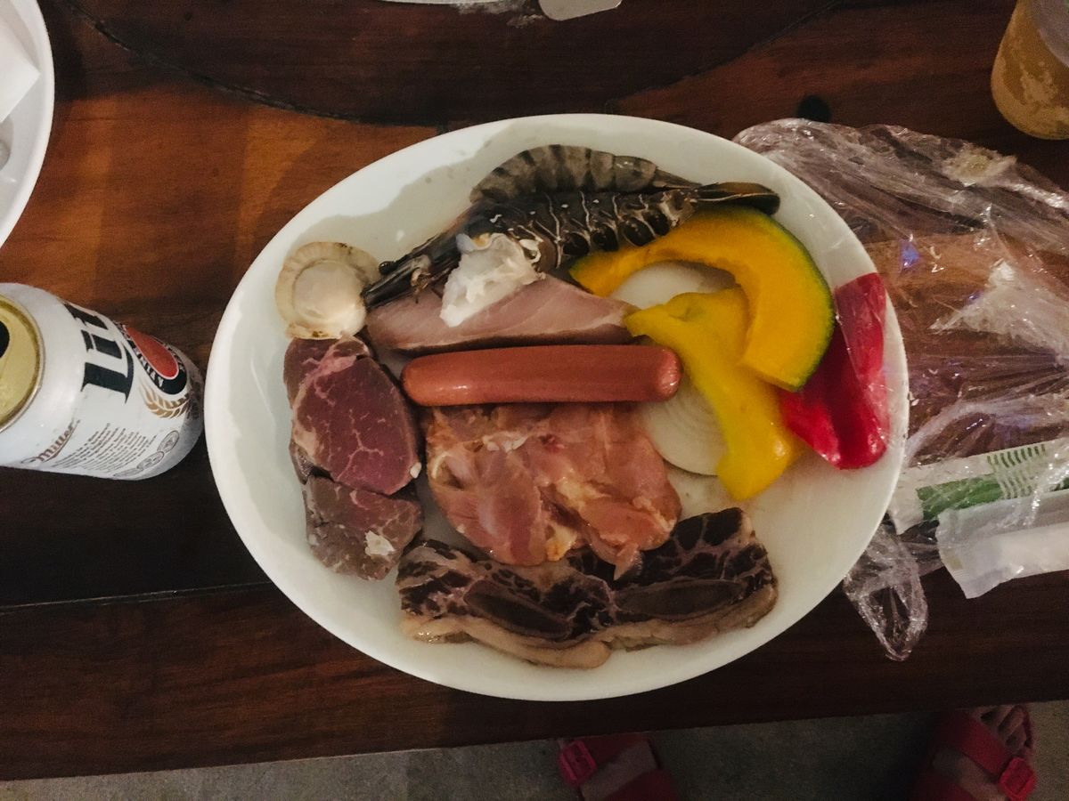 その日は朝からずっと雨が降っていて不安だったのですが、ちょっとBBQ会場までの道ではほぼやんでいて良かったなぁと思っていたところ、、席について少し経ったら大雨と強風で前の方の席の人はシャワーみたいになってました。後ろの方の人は上のテント?に溜まった水が落ちてきて席移動してたり、、どの席の人もほとんどみんな配られたタオルを頭や肩にかけていました!大変なときに来ちゃったな〜と思ってたんですが、現地のスタッフさんが謝るばかりでなくジョークとかで笑わせてくれたり、必死になって食べたお肉も美味しかったし、なかなか無い経験ができて良かったと思っています!