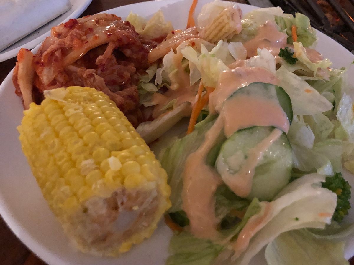 サラダ、ポテト類、素麺、ごはん、コーン、キムチはブュッフェスタイルだったので取りに行きました。