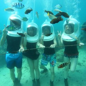 アクアウォーク→工場地帯のような所を抜けてすぐのところで行いました。正直え、ここでやるの?という感じです。左側には何かのタンクやら重機が見えますので雰囲気重視される方には不向きです。アクアウォーク自体は浅歩いて海に入りしゃがんだ格好でヘルメット?を被り、そのまま少し深いところまでロープを伝って歩いて行きます。スタッフが水中で魚肉ソーセージみたいなエサをくれるのでそれをあげると魚がたくさん寄ってきて楽しかったです。イメージするような色とりどりの魚ではないですがどれも可愛らしいです。