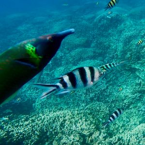シュノーケリング中にはイカを投げることで魚を間近で見る事が出来、迫力がありました。