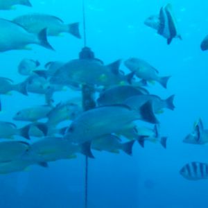 最初に海中展望塔見学でしたが、長い桟橋の途中で現地担当者がサメにエサを与えていました。