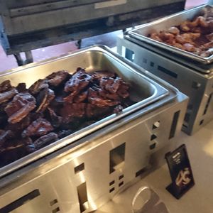 料理はロブスターテイルはパサパサでイマイチでした。ショートリブ、シュリンプカクテル、サラダや冷菜は美味しかったです。オンワードに宿泊していたので食事に関してはヒルトンの方が素材が1つづつが良かったですが、ビュッフェの種類が少ない事、ビュッフェの撤収が早いのでショーが始まる前に8割は食事を済ませないと食べ損なう可能性があります。席にもよりますが前の方だとショー中は離席しづらいです。私はデザートが食べれませんでした。