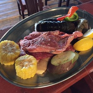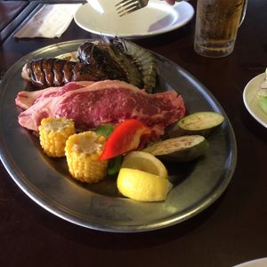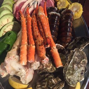 お肉お魚は、ステーキ3枚・鶏もも肉2枚・ロブスター2匹・エビ2匹、他にお野菜3種類(各2つずつ)。これにサラダバーとドリングバーが付いています。