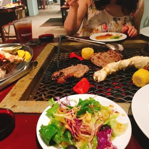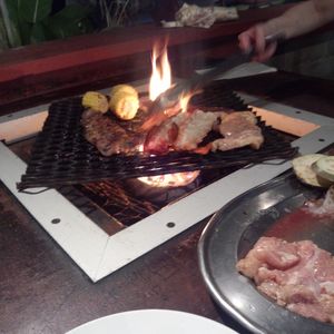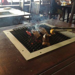 良い席を予約してくれるのはありがたいが、そもそもBBQに不慣れだと、肉やエビをどう焼いて良いものか分からない。BBQのやり方を少し勉強していった方が良いですね。肉もエビも鉄板の上に置いたからと言って、すぐに火が通るものでもなく、すさまじい煙もくもくの中、肉やエビと格闘する感じで食べます。量も決して多くはないです。少し多めに頼んだ方が良いですね。追加ができるって訳でもなかったように思います。味もついていないので、適当に塩をふって食べます。