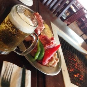 通された席はテラス席の中でも一番店側。外側に出来ないか店員さんに聞きましたが、大人数の方専用で二人できた私達はダメでした。。お肉の味は普通!量は沢山でした。
