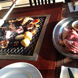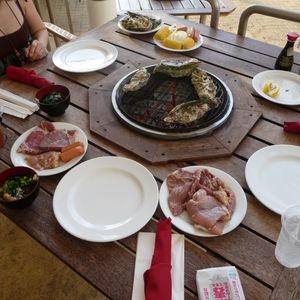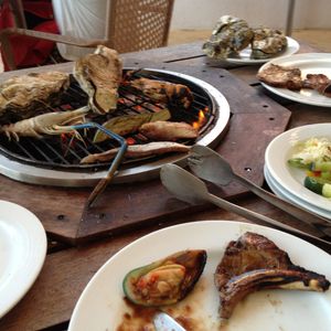 海辺の屋根つきの広いテラスみたいなところで、自分達で焼いて食べるスタイルです。