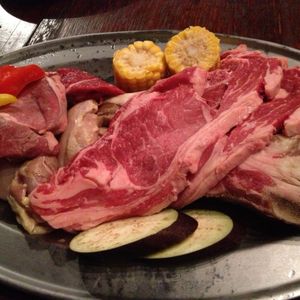 開店と同時に入ったので席に通されるとすかさず生の肉と野菜が盛られた皿が置かれ飲み物聞かれ・・・といった感じでした。