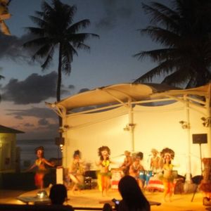 時間どおりに迎えのバスがホテルまで来てくれ、迷わず現場までたどり着くことができました。後ろの席でしたが、階段状になった所にテーブルが設置されており、どの席からも舞台が見えやすいようになっています。当日はあいにくの雨でしたが、屋根付きの会場で、問題なく楽しむことができました。バーベキューの具材は自分で好きなものを好きなだけ取りに行く形式です。カキやエビがおいしく、肉類もボリュームがありました。デザートやフルーツも種類が多く、また、そうめんもありました。飲み物は少なくなると、スタッフさんがすぐに注ぎに来てくれ、サービスも行き届いています。お腹がいっぱいになった頃、ショーが始まりました。ドラムのリズムに合わせてのアップテンポのダンスで、たいまつを使ってのファイアーダンスも迫力がありました。ショーが終わった後も、ダンサーが各テーブルを回り、挨拶してくれ、記念撮影にも応じてくれました。数時間があっという間で、とても良い思い出になりました。
