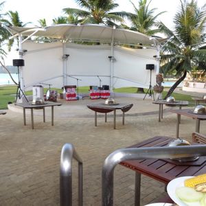 途中、激しいスコ−ルがありましたが、屋根付きなので全く問題無し。ただ、ステ−ジ前の方たちは可哀想な状況でしたが・・・でも、雨があがるとスタッフの方たちが、濡れた食材や飲み物を素早く片付け、新しいものと交換してました。