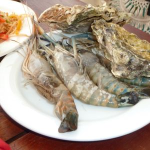 食事はB.B.Qで岩牡蠣 エビなど美味しかつたです フルーツ