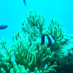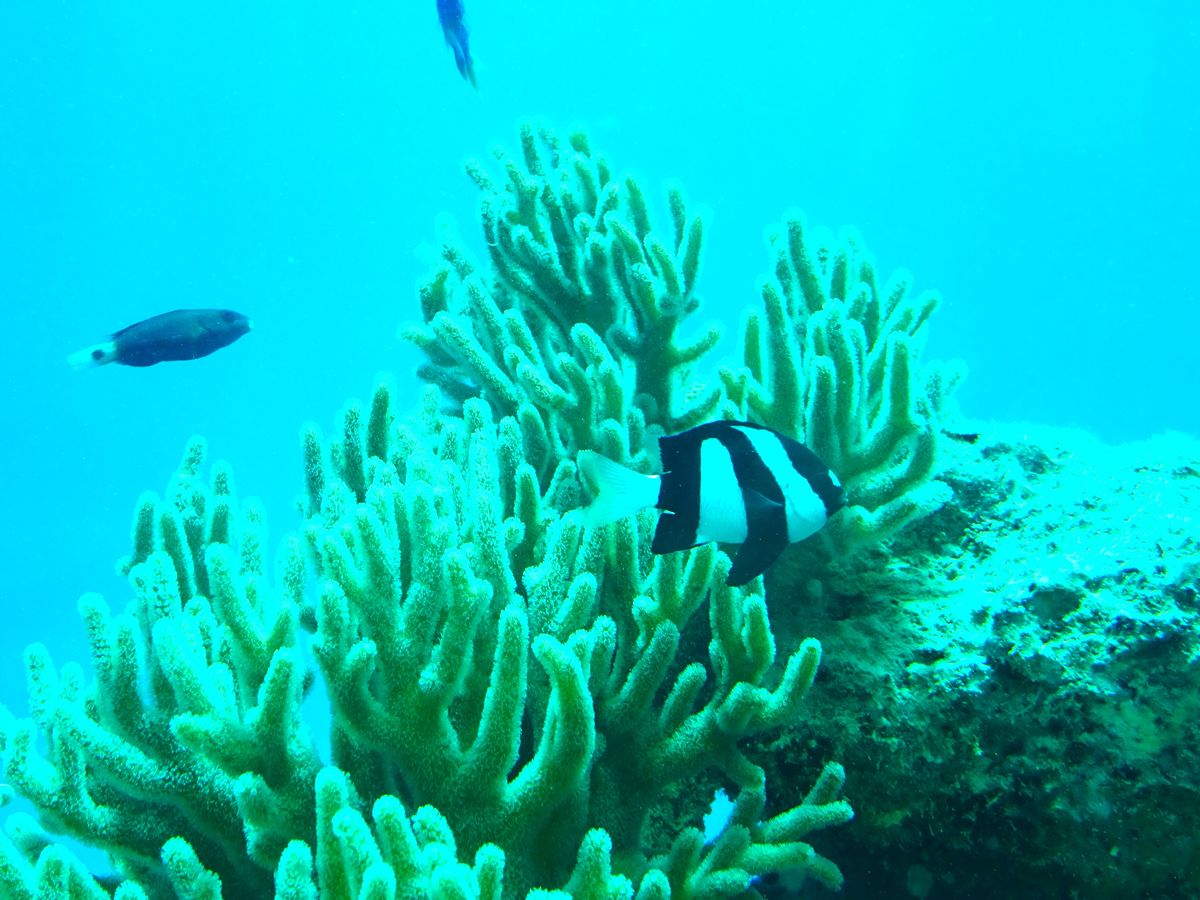 スノーケルとマスク、マリンシューズ、ライフジャケットを無料で借り、スノーケルを午前中に1時間くらい楽しみました。ブレイン珊瑚、紫色の珊瑚がところどころにあり、トロピカルな魚も数種類見られました。沖縄の慶良間諸島ほどではないですが、沖縄本島よりは綺麗だなと思いました。満足です。