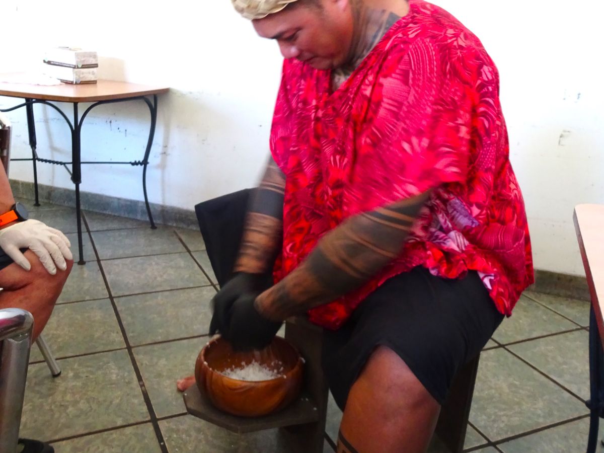 スタッフが参加者を楽しませようとあれこれ用意してくれています。昔の住居を再現した場所を散歩しながら咲いている花や木の説明を聞いたり、ココナッツを割ったり火を起こすデモンストレーションを見たり、上陸した後のアクティビティの時間も長い。じゃんけん大会やココナッツの葉っぱで魚の飾り物を作ったり、体験型のアクティビティーも用意されていました。