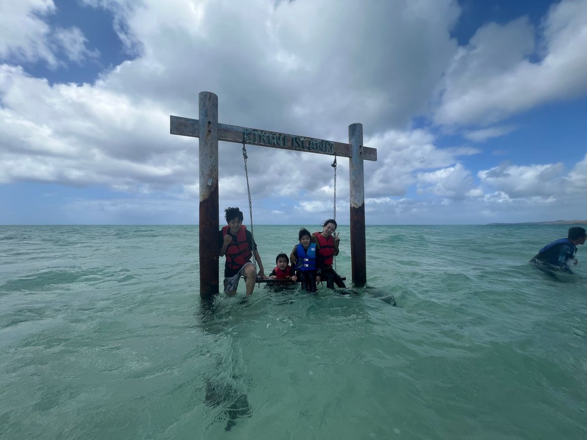 初めに船に乗りイルカウォッチに行きましたが3ポイントぐらい周りましたが観られず、それはしょうがないとして、時間がかかったせいなのか分かりませんが次に到着したビキニアイランドでは満潮気味でブランコの椅子の辺りまで水が来てしまっていて思っていた感じと違ってしまいました。