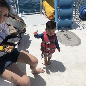 その後のシュノーケリングは少し風が強いためトランポリンは出来ない上、魚もあまり集まらず、すぐに船上に戻り少し残念でした。ライフジャケット着用なので問題は無いのですが思ってた以上に深い所でのシュノーケリングでしたので子供は怖がっていました。