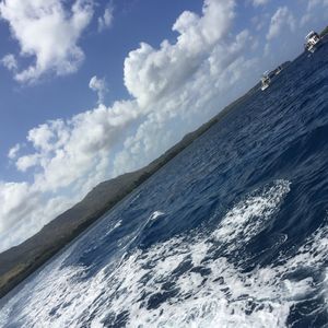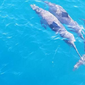 前回ハワイで、ウミガメと一緒に泳いできたので、今回はイルカを見に行きました。実際見れるのは、数匹ぐらいかなと思っていましたが、予想を上回る数のイルカの群れと、ボートが作る波を楽しそうにピョンピョン飛び跳ねながら追いかけてくる、イルカたちの愛らしさに非常に興奮しました。