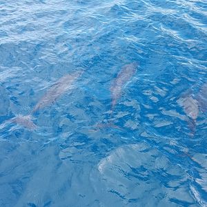 海で泳ぐイルカの群れ、初めて見ました。5組以上の群れに出会え、楽しかったな。ウミガメも見れました。