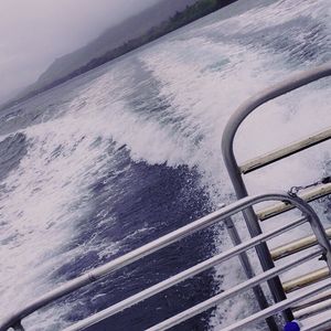 朝は曇りで、1日もってくれるかな~と思っていたのに、船に乗る前から雨が降り出してきました。でもまあまあ小ぶりだったので船の前のデッキへ行ってみると、船のスピードで雨粒が当たって痛かった。