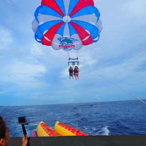 バナナボートは船に乗っている人みんなで行い、バナナボート特有の引っ張ってる船に振り落とされる!みたいなのはなく、ただ引っ張られているだけでした。パラセイリングは椅子型でなく、紐に座るタイプのものだったので、楽しめました!イルカはお天気も悪く残念ながら会えませんでした。