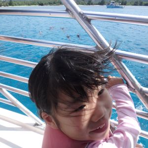 お天気良くて、波もそんなになくて、酔い止めは飲んでおきましたが、心配していた船酔いも全くなく、イルカウォッチング楽しめました。行きのバスでは、日本人ガイドのトモさん、ヒロさんが、ツアーについてとても丁寧に説明してくださり、安心して参加できました。イルカは、あまり近くには寄ってこなかったですが群れになって泳ぐ姿を何度か見れました。子供達もイルカを見つけてとても喜んでました。