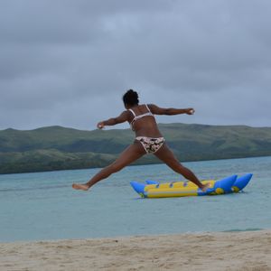 ビキニ島に上陸し記念撮影後、ジェットスキー。船までの送迎は、バナナボート。