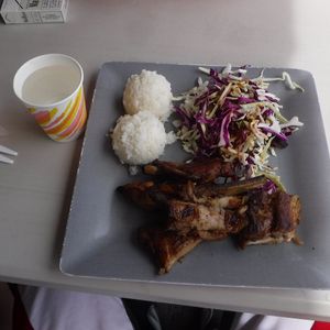 写真を参考にしてください。写真が1人分です。味は日本人好みの味です。余っていればおかわりも言えばもらえます。ただしハエが多いです。