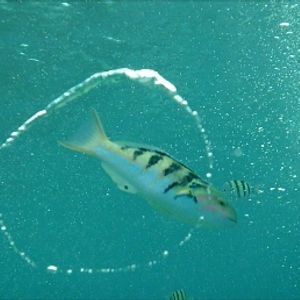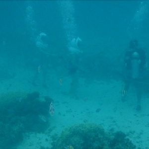 岸からロープを伝って歩いて潜っていくので、そんなに深いところではないのですが、大丈夫そうだとなると、我々3人をロープから手を放して泳がせてもくれました。