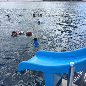 イルカは沢山見られ、跳ねてる姿で子供も大興奮。ちょうど飽きた頃に水上トランポリンと滑り台登場の海上シュノーケル体験。魚にさほど興味ない子供たちはトランポリンと滑り台のおかげでとっても楽しく過ごしました。