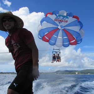 親子3人で初めてのパラセーリングにチャレンジ。待ち時間が退屈かなと心配でしたが、14人の参加で2人ずつ飛ぶので、まったく退屈せず。ドキドキしながら順番を待つのも楽しかったし、その間もボートは動いているので、気持ちのいい風を受けながらクルージングを楽しめました。空に上がってからも最高!思った以上に高かったけれど怖くはなかったです。