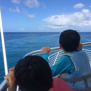 8歳、6歳の子連れでした。シュノーケリング、船、水上トランポリンに滑り台、何もかも初めてで不安でしたが、ヒロさんのガイドも的確で怖がらずに安全にたのしめました。時間も半日なので足りないのでは?と思いきや、飽きすぎず疲れすぎず残りの半日も有効に使えました。もちろんイルカもみれましたが台風の影響でイルカファミリーのテンションがいまいちっぽかったです。一つだけ言うならば船上のお手洗いが少しにおったかな。。。家族全員我慢しちゃいました。