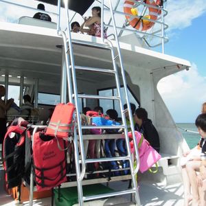 パラセイリングとバナナボートを追えイルカウッォチング用の船に移動しました。すでに人がたくさん乗ってました。この船は2階もありキレイでした。荷物置き場も専用の棚がありました。