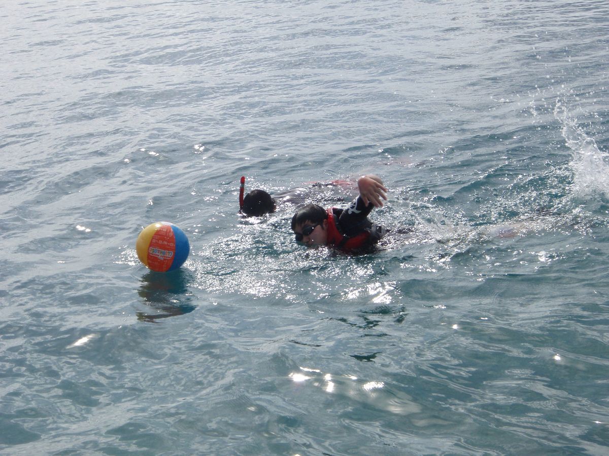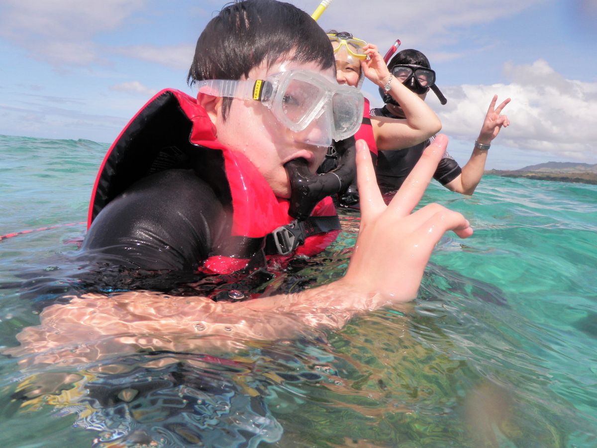今年はシュノーケルに参加しました。あいにくの天気で雨がパラパラ凄く寒い!海に入ったら水温が高く驚くほどの透明度で魚もいっぱいいました。餌はイカ 手でちぎってあげるも魚が大きいから1口でパクリ迫力ありました。