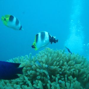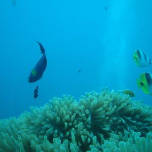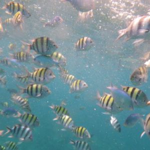 写真は、海中展望塔で見たお魚たちです(ノーフラッシュ撮影)。このお魚たちと近くの珊瑚付近で戯れることができます。