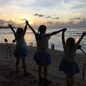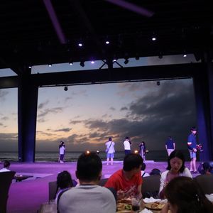 小学一年生の娘を連れて、家族三人で参加しました。オンワードビーチリゾートからお迎えのバスに乗り、各ホテルを回りながらゆっくりと会場に向かいました。会場に着くと受付を済ませて、席に案内されます。今回は、VIP席にしたので、ステージ中央付近のテーブルでした。雰囲気を楽しむのであれば、VIP席でなくとも十分かも知れません。まだ日が落ちる前だったので、ステージ越しにサンセットも楽しめました。ビュッフェは、広告の豪華な写真とはちょっと違うかな〜とは思いましたが、まずまずかな…と思います。少なくなった料理はどんどん補充されていましたので、急ぐ必要はありません。食事をしながらショーが始まるまでの時間は、ギター弾き語りのお姉さんが、心地よい歌を歌いながら、ステージをゆっくりと歩き、お客さんと一緒に写真を撮ったりしています。この時間帯は、お客さんも結構自由にステージに上がったりしています。