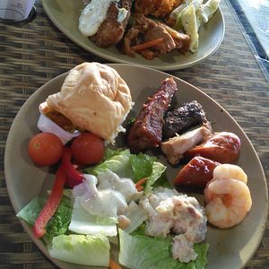 はじめにBBQの食べ放題でした。テーブルからは、地平線まで見える広い海が広がり、夕日がとてもきれいでした。