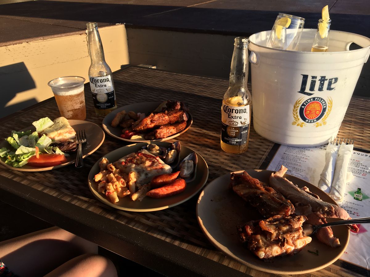 はじめにBBQの食べ放題でした。テーブルからは、地平線まで見える広い海が広がり、夕日がとてもきれいでした。