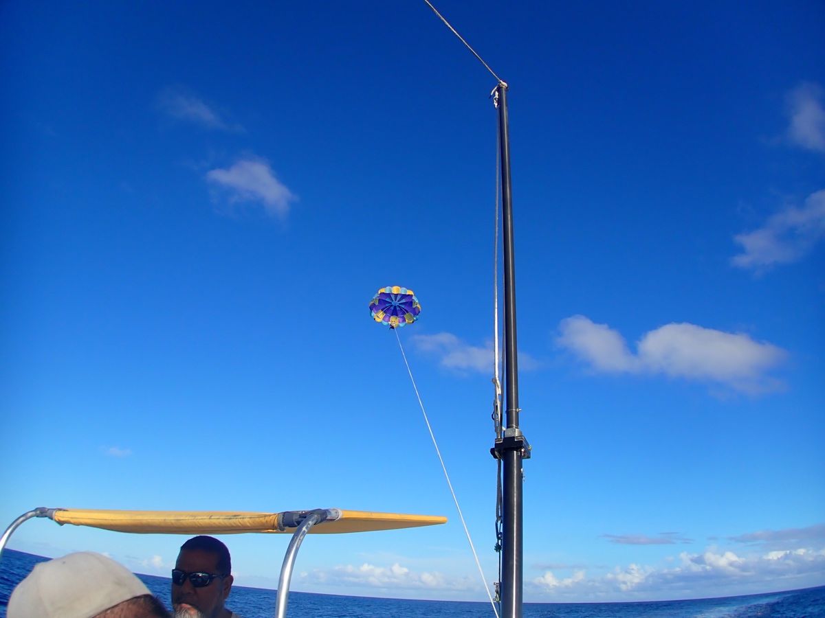 初めてのパラセーリングでしたが最高でした。カメラを二つ持っていき、一つは上空から自分で撮影。もう一つはボートの上から私たちを撮ってもらい、いい思い出になりました。