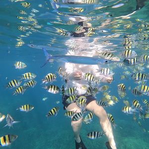 シュノーケルは、足がつくポイントから、足がつかないようなポイントまで、参加者に応じて対応してくれます。ソーセージをガイドさんが買ってきてくれて、餌付け体験をしたりと大満足です!