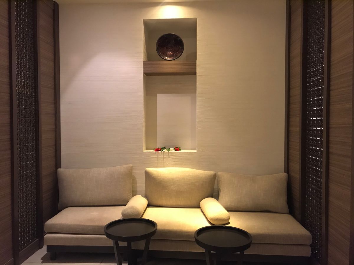 スパの入っているデュシタニホテルは初めて訪れましたがホテルのいたるところが素敵な上、スパの入ったところから豪華なシャンデリア、その後案内されるリラクゼーションルームも優雅でかなりテンションが上がりました!そちらでお茶をいただき、その後施術のお部屋のシャワーを浴びる流れでした。私達の予約したコース(Inspired Massage 90分)は更衣室やお風呂(広くてあったまれると口コミにあったので利用してみたかったのですが^^;)は使えずその点は残念でしたが、ちゃんと2人一緒に施術してもらえるお部屋で綺麗で癒されました。