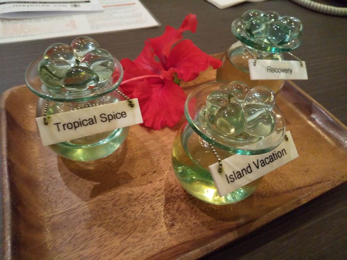ロビー階からエレベータで2つ下の階のアユアランへ。ホテルのスパらしい高級感が漂います。問診票に記入後、3種類の中から好みの匂いのオイルを選びます。ここまでのやりとりはすべて日本語です。