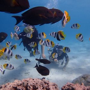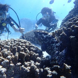 家族3名で参加し、他の家族2名と合計5名でインストラクターが2名付きました。ビーチからのエントリーでしたので潜れる場所まで海の中を歩くのが大変でした。インストラクターの説明は必要最低限で体験ダイビング自体の内容については満足しています。ビデオも撮って貰って後でCDも戴けましたので良かったです。残念だったのはウェットスーツが半袖、半ズボンタイプでしたので、着たり脱いだりは楽ですが、海の中で海底の岩やサンゴに足が擦れて両足が傷だらけになってしまいました。初心者は潜る深さをうまく調整出来ないので、長袖タイプのウェットスーツを準備して頂けるとありがたいと思いました。