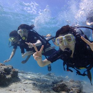 娘、孫、お店の女の子3名、計6人で参加させてもらいました!キャンペーンに惹かれて何も考えず申し込んだのですが…(^◇^;)上級者向けのコースだよ‼️っと言われ…初心者約2名は固まり…私も年齢が年齢なので…(^◇^;)(^◇^;)少し不安でした(^◇^;)ロープもないよって言われ…ますます不安でしたがインストラクターさんの大丈夫!大丈夫!何も考えず楽しもう⁽⁽٩(๑˃̶͈̀ ᗨ ˂̶͈́)۶⁾⁾と言われ、出来そうな気がしてきましたw実際、浅瀬からの練習も手際よく親切に厳しく(笑)丁寧に教えてもらいダイビングするまでの不安は一切なくなりました(﹡ˆᴗˆ﹡)心配だった耳抜きも教えてもらった通り痛くなる前にすれば何の問題もありませんでした!浅瀬で1人女の子が一瞬パニックになりかけ水面に顔を出そう出そうとしてるところ、絶対に出してもらえなかった(笑)そのお陰で最後までダイビングを楽しめ貴重で素敵な体験ができました!あとから女の子に聞いたら、あの時水面に顔をだしてたら多分もうダイビングが怖くて1人離脱してたと思うって言ってました!インストラクターさんの厳しさ(笑)と皆んなで最後までダイビングさせたいという優しさのお陰で本当に楽しかったです!ロープもなしで自由にダイビングさせて
