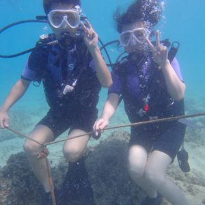 旦那と二人で参加しました。泳ぐことが苦手で不安でしたが分かりやすい説明と、安心感のある岡さんのおかげでとっっっても楽しむことが出来ました!コツを掴むまでに時間がかかってしまい、もっともぐっていたかったぁ〜!!また来たい!と感じました!!なので、2ダイブがオススメです!また、帰りに撮ってくれた写真が入ったCDももらえて、帰って見るのがとても楽しみです!ダイビングにハマりそう!!!とても楽しい体験をありがとうございました!