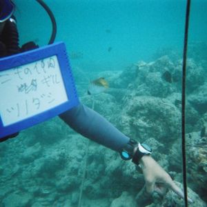 海岸についてからは、ちょっとお茶をいただき、ダイビングの同意書等を書いてから、日焼け止め(アネッサのウォータープルーフを使ったので、カンカン照りでしたが日焼けせずに済みましたw日焼け止めが無いと腕がロブスターみたいになると言われました。)をしっかり塗って、耳抜きの仕方、トラブルサイン等々教えてもらい、ウェットスーツ(ハーフ)とマリンシューズ、その他一式を貸して頂き、水辺で少しトレーニングしてからダイビングをしました。彼女も私も耳抜きが始めうまく行きませんでしたが、ユキコさんが丁寧に教えてくれたおかげで水深6mほどまでも潜る事ができ、いろんな魚に餌付けする事ができ、めちゃくちゃ楽しかったです。ホワイトボードを使ってユキコさんが、魚の名前を