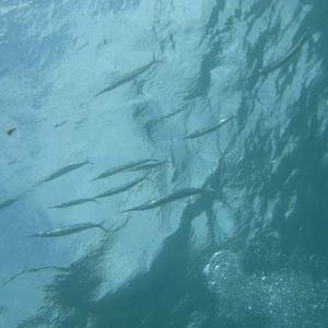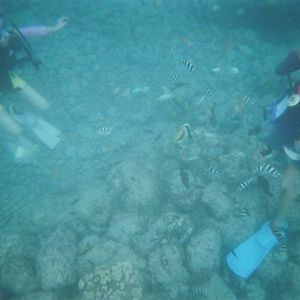 潜った所は4~5m位かなぁ、潜り始めると徐々に耳が痛くなりまして、これか!耳抜きの必要なわけは!と一生懸命にふんがふんが頑張り、何とか成功…耳の痛みが引いてからは海の中をゆっくり眺めることが出来ました。浅瀬にもかかわらず珊瑚はありますし、何より魚の数が多いのにびっくりデス。クリスさんから渡されたソーセージを千切って放り投げるとすごい勢いで魚が寄ってきますし、ちょっと大きい魚などは手に握ったままのソーセージを狙おうと手を突いてきたりと、魚たちには驚かされ、クリスさんが見せてくれた水中での空気の輪っかには驚かされ…あっという間のビーチダイブでした。上った後は、温かい紅茶を貰い、昼食のお弁当をピクニック気分で食べて